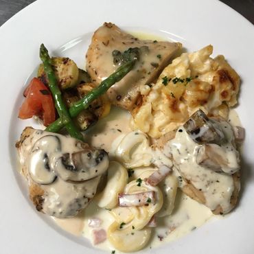 Boneless and Skinless Breast Topped with Whole Sautéed Mushrooms in a Light Cream Sauce