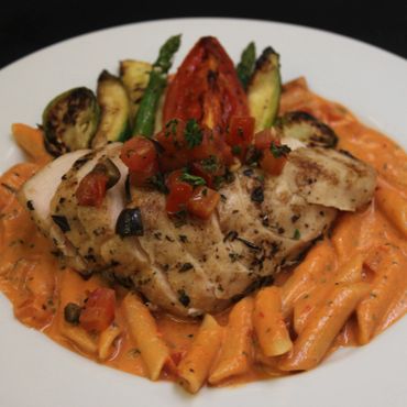 Boneless Breast Topped with Artichoke Hearts, Fresh Tomato, Basil, & Black Olives in a Light Cream Sauce